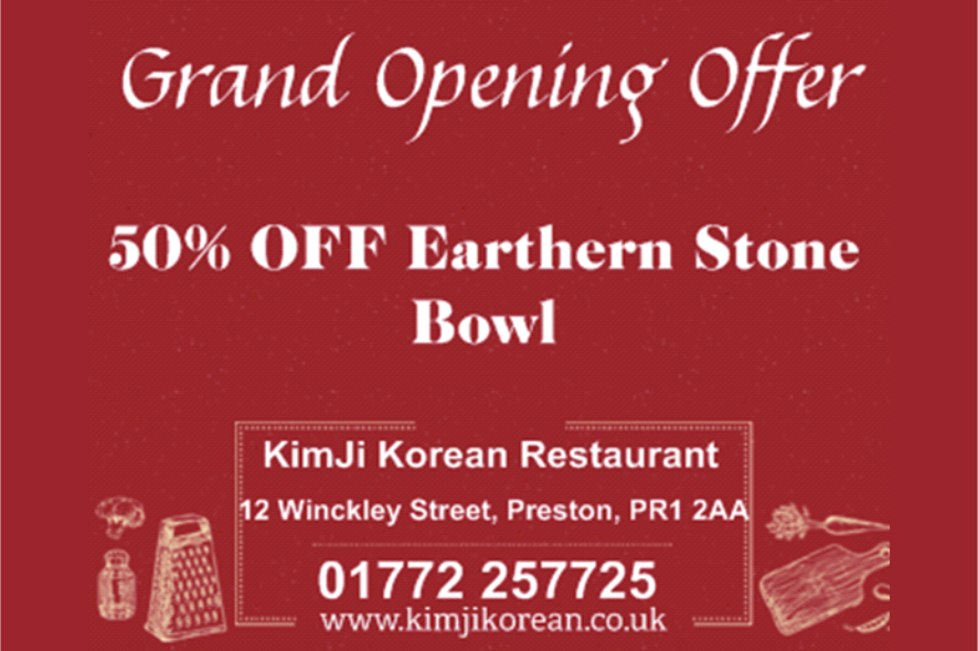 KimJi Are proud to announce the opening of our restaurant in Preston. For a special offer discount, present the below image on your smartphone or print out the voucher and bring it with you when you visit for a 50% discount on our Earthern Stone Bowl Dish.
